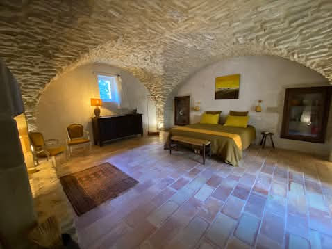 This spacious room, defined by its crossed stone vaults, period fireplace and terracotta flooring, is enhanced by soft lighting and natural materials, creating a deeply restful atmosphere.