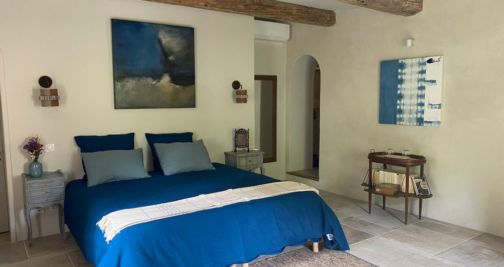 A spacious room dressed in deep blue tones, bathed in natural light through its windows opening onto the park. The comfortable bathroom, discreetly accessible through a concealed doorway, completes an atmosphere designed entirely for well-being.